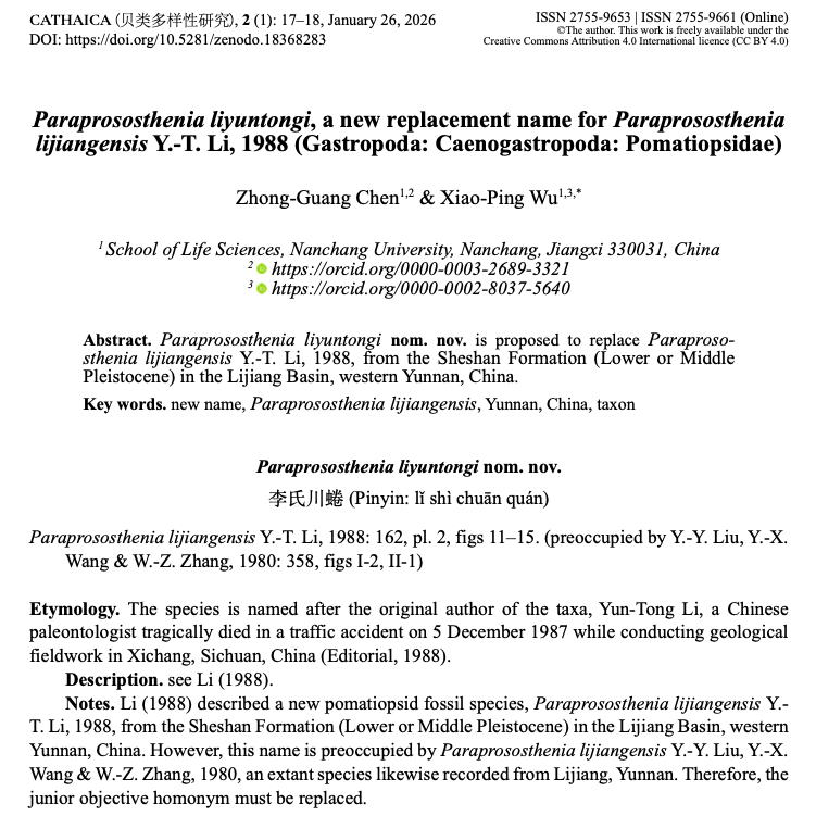 Paraprososthenia liyuntongi, a new replacement name for Paraprososthenia lijiangensis Y.-T. Li, 1988 (Gastropoda: Caenogastropoda: Pomatiopsidae)